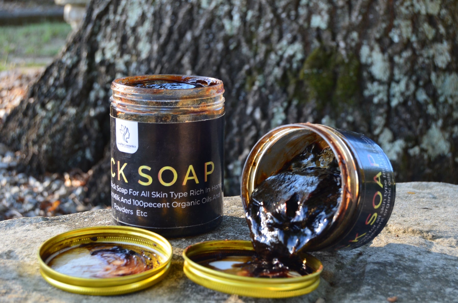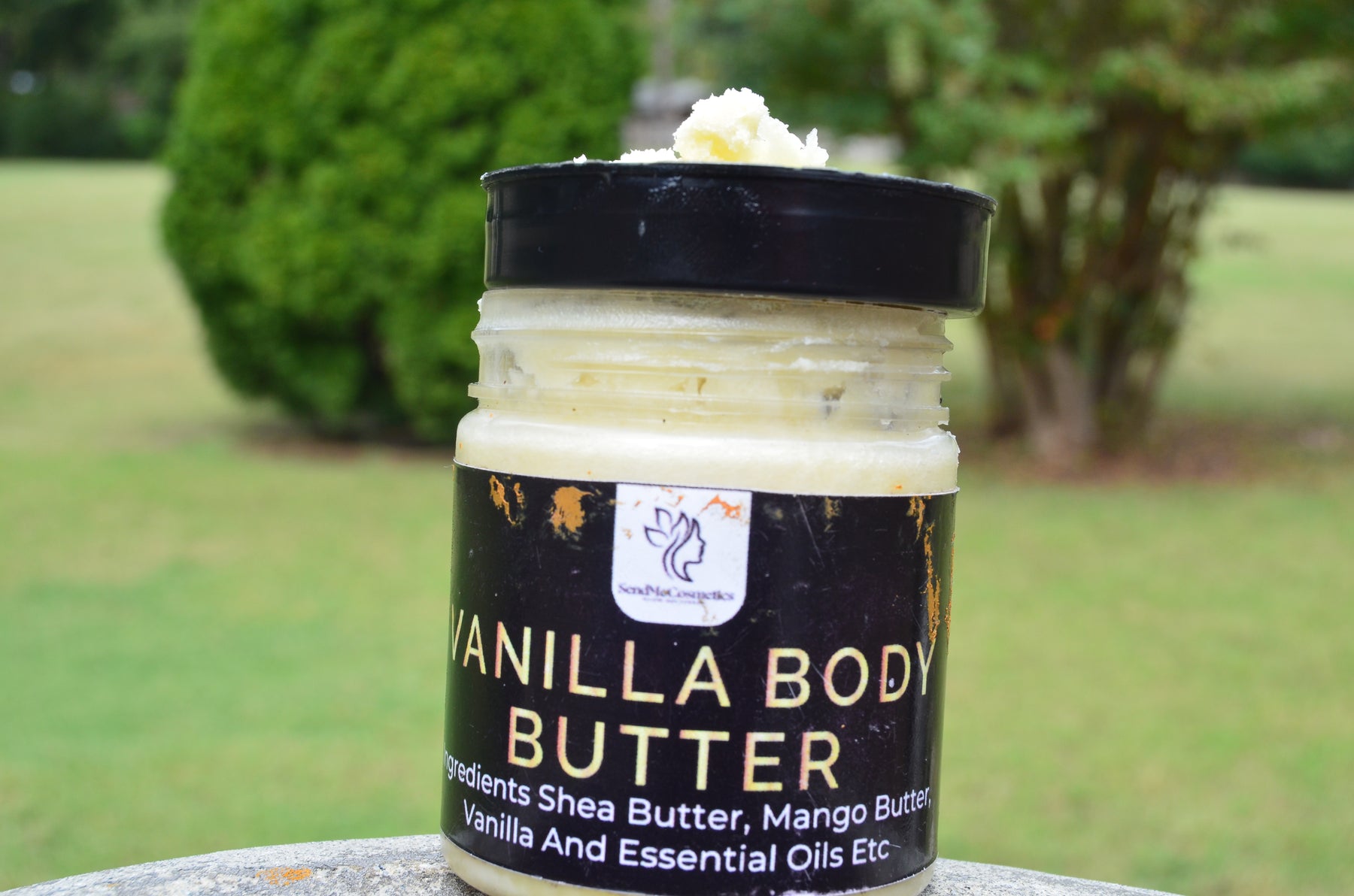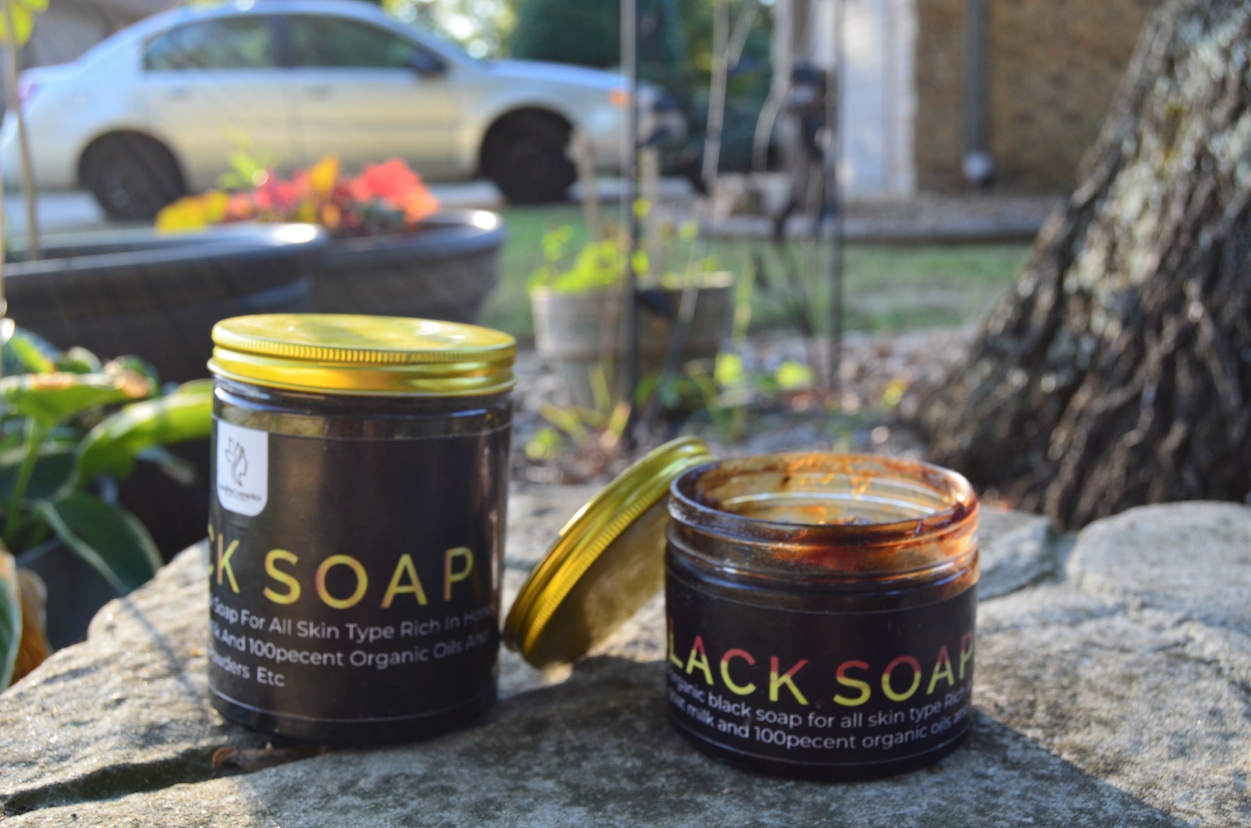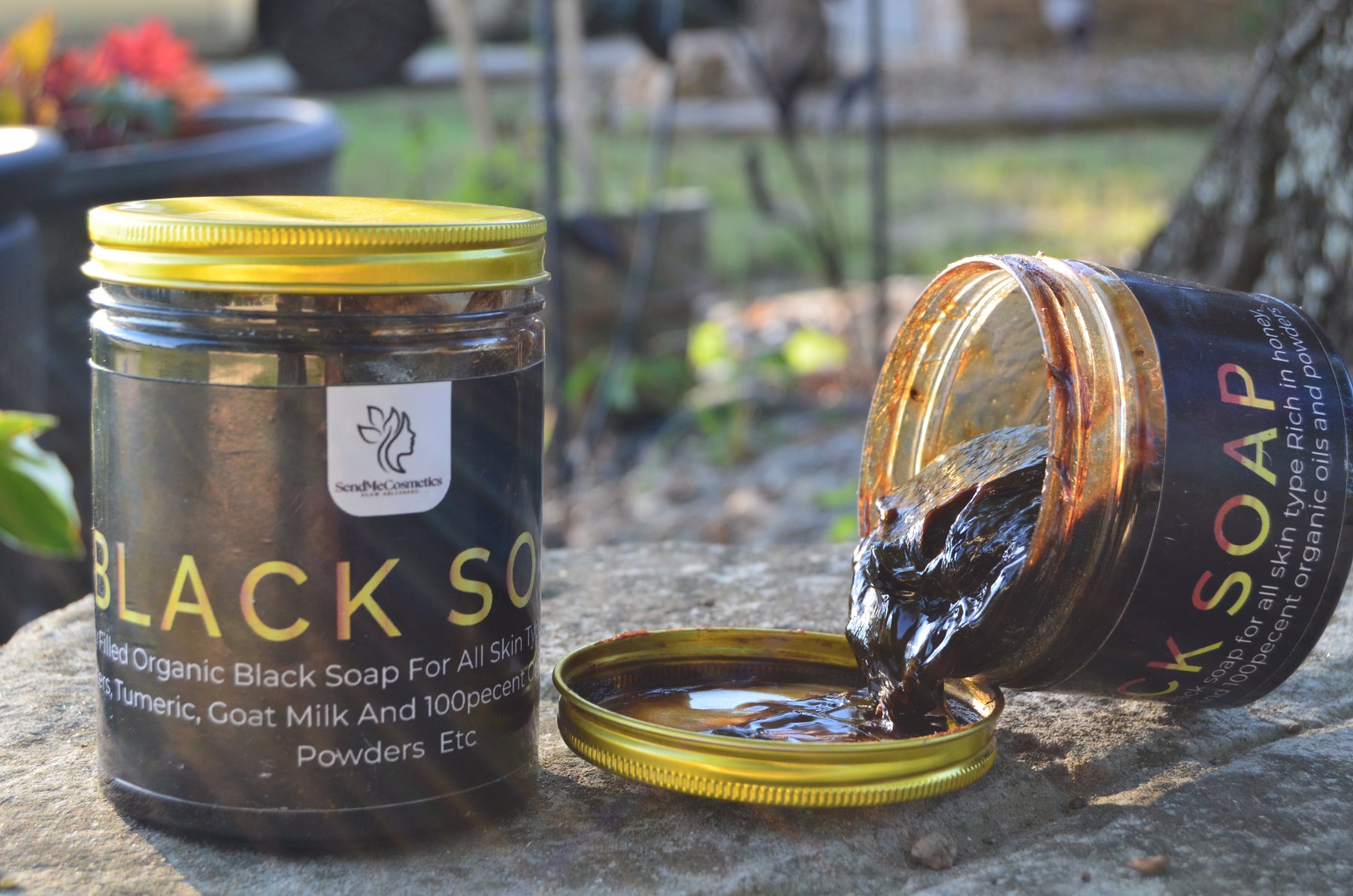 Send Me Cosmetics brand Honey Baked Black Soap (250ml) left, Vanilla Body Butter Center, Honey Baked Black Soap (500ml) right