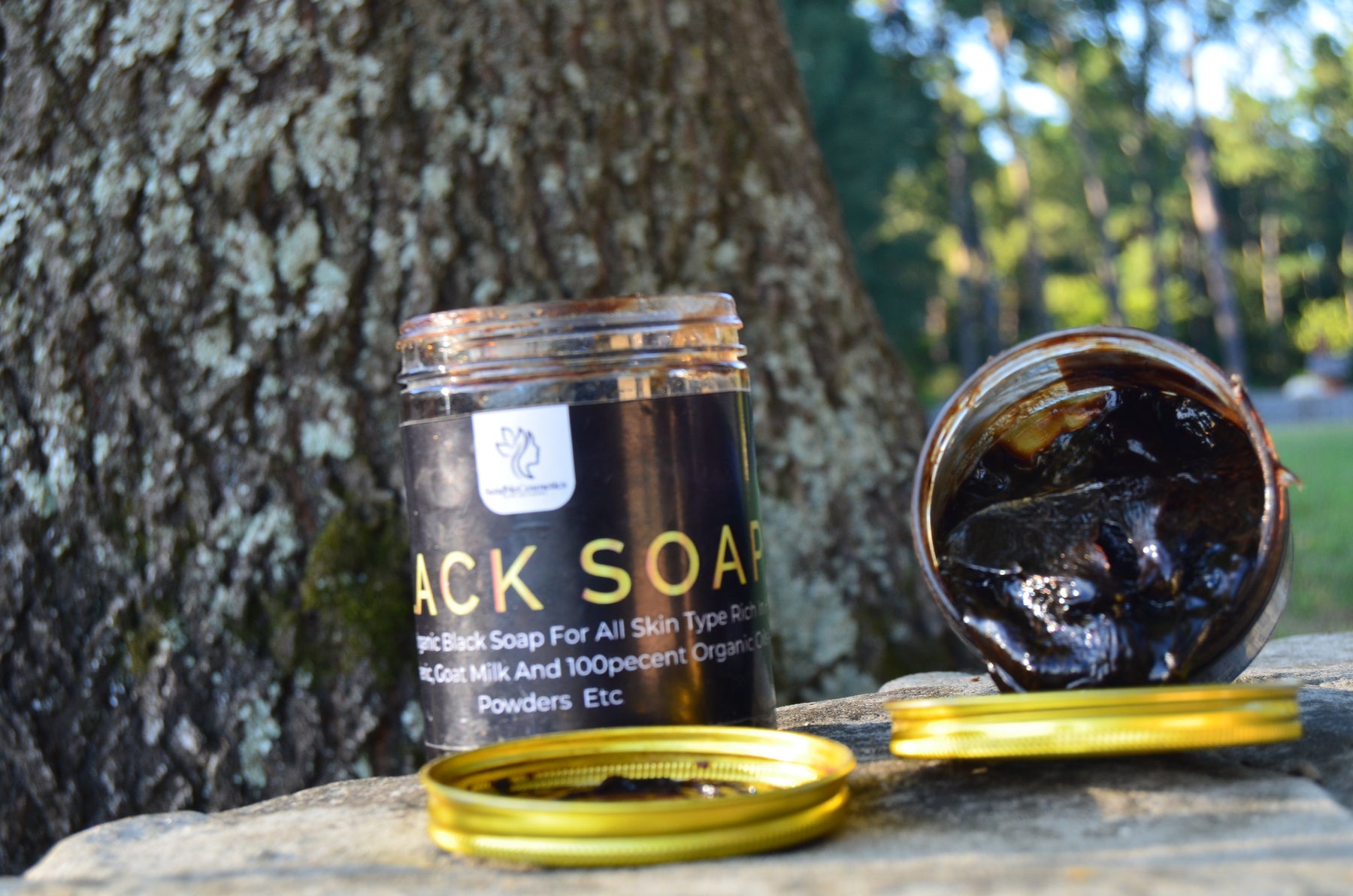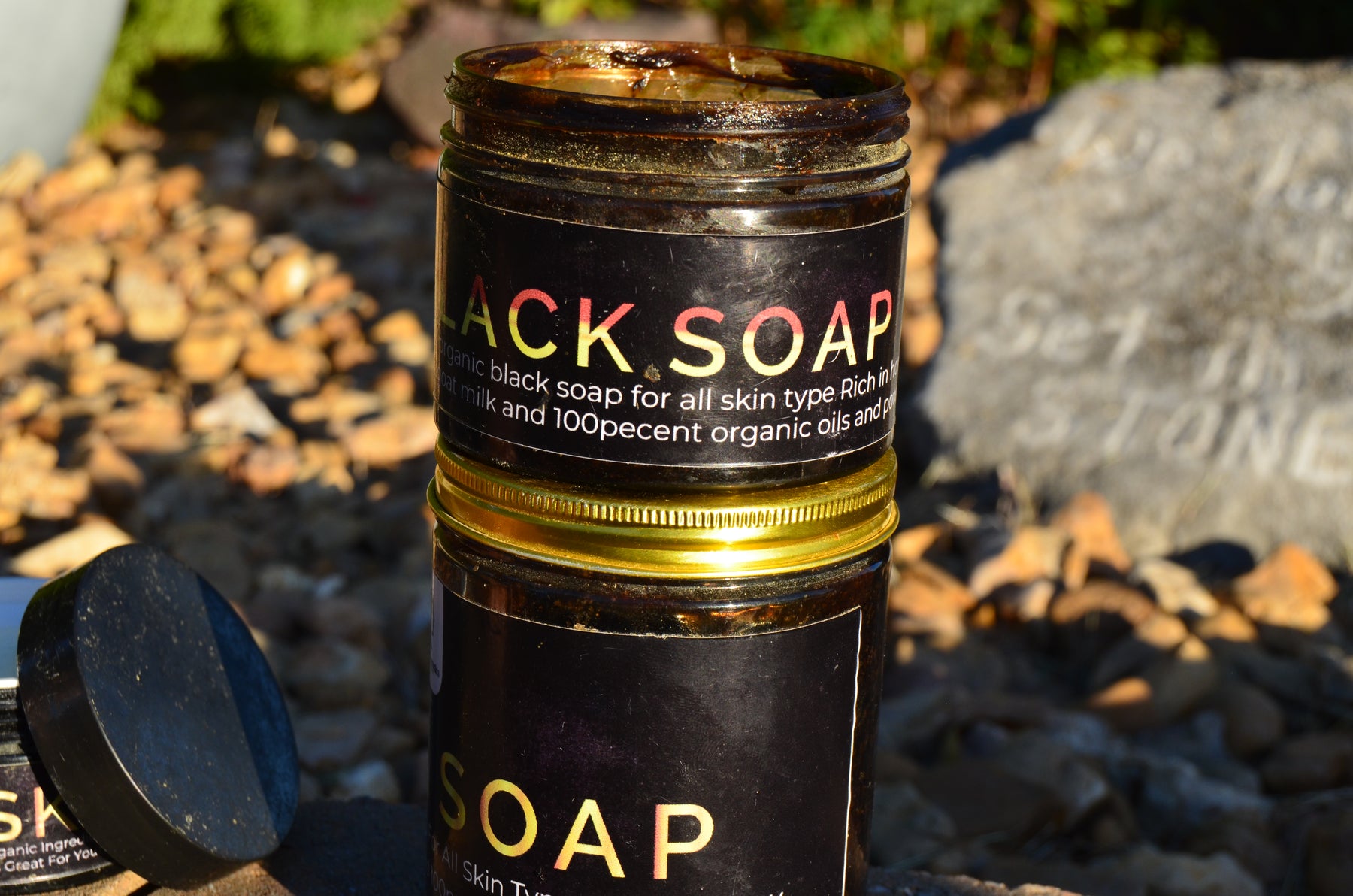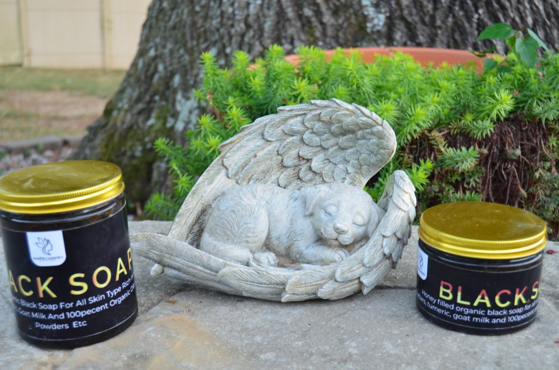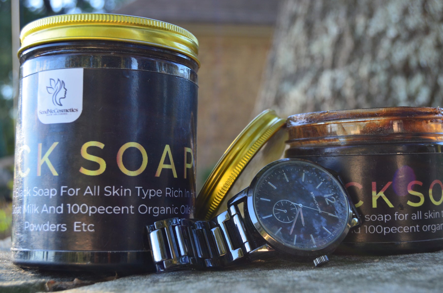 Send Me Cosmetics brand Honey Baked Black Soap (250ml) left, Vanilla Body Butter Center, Honey Baked Black Soap (500ml) right