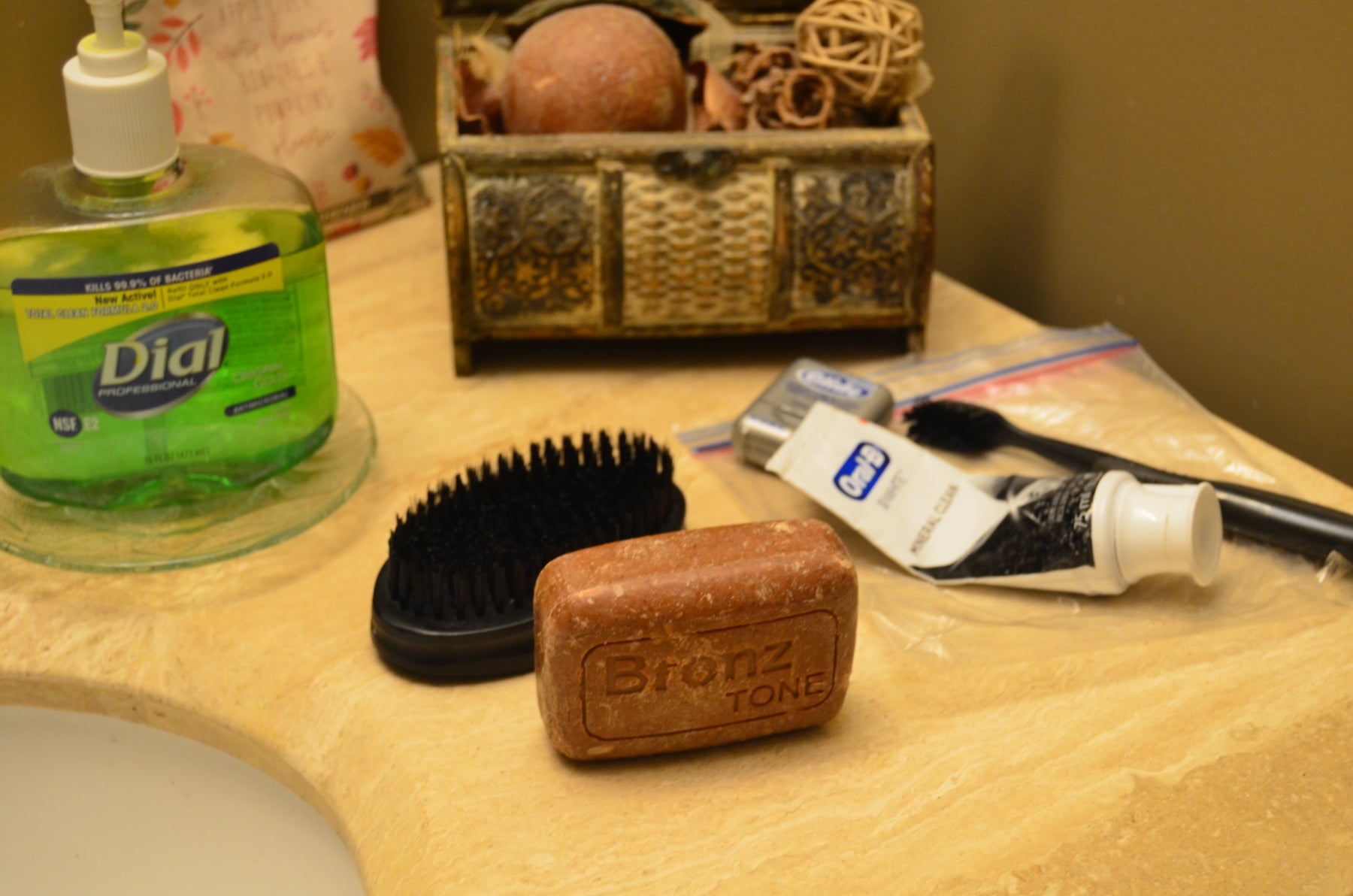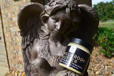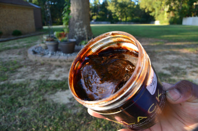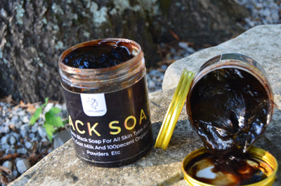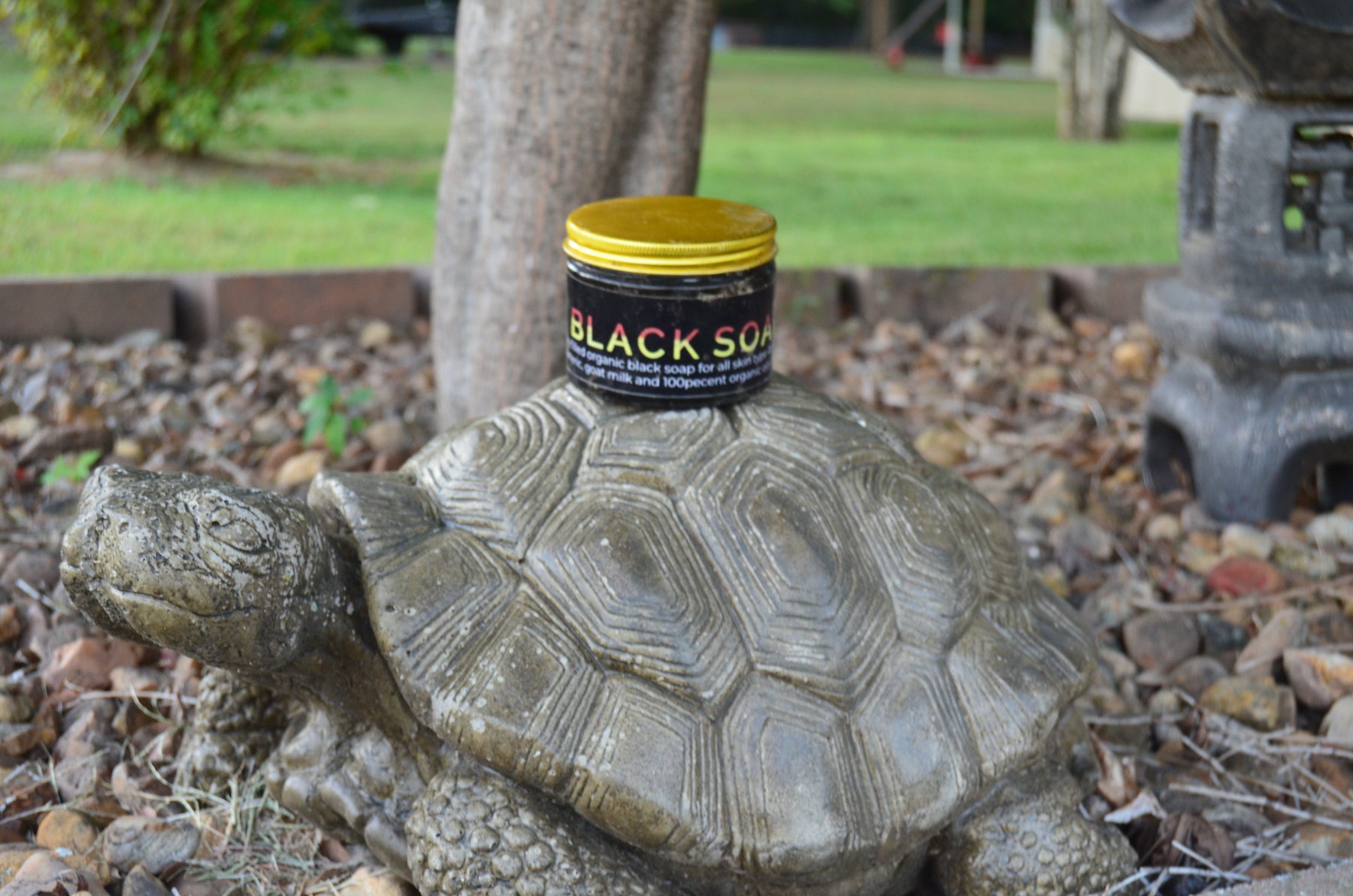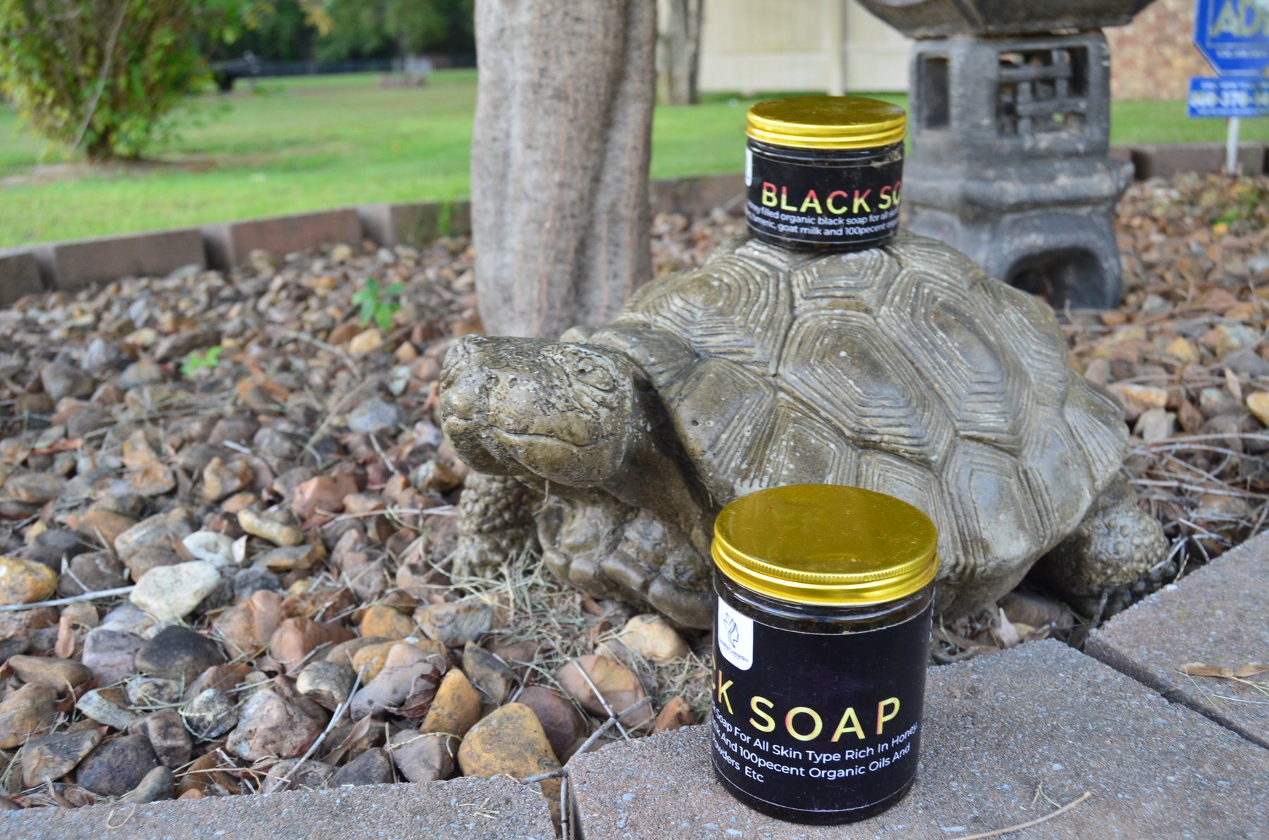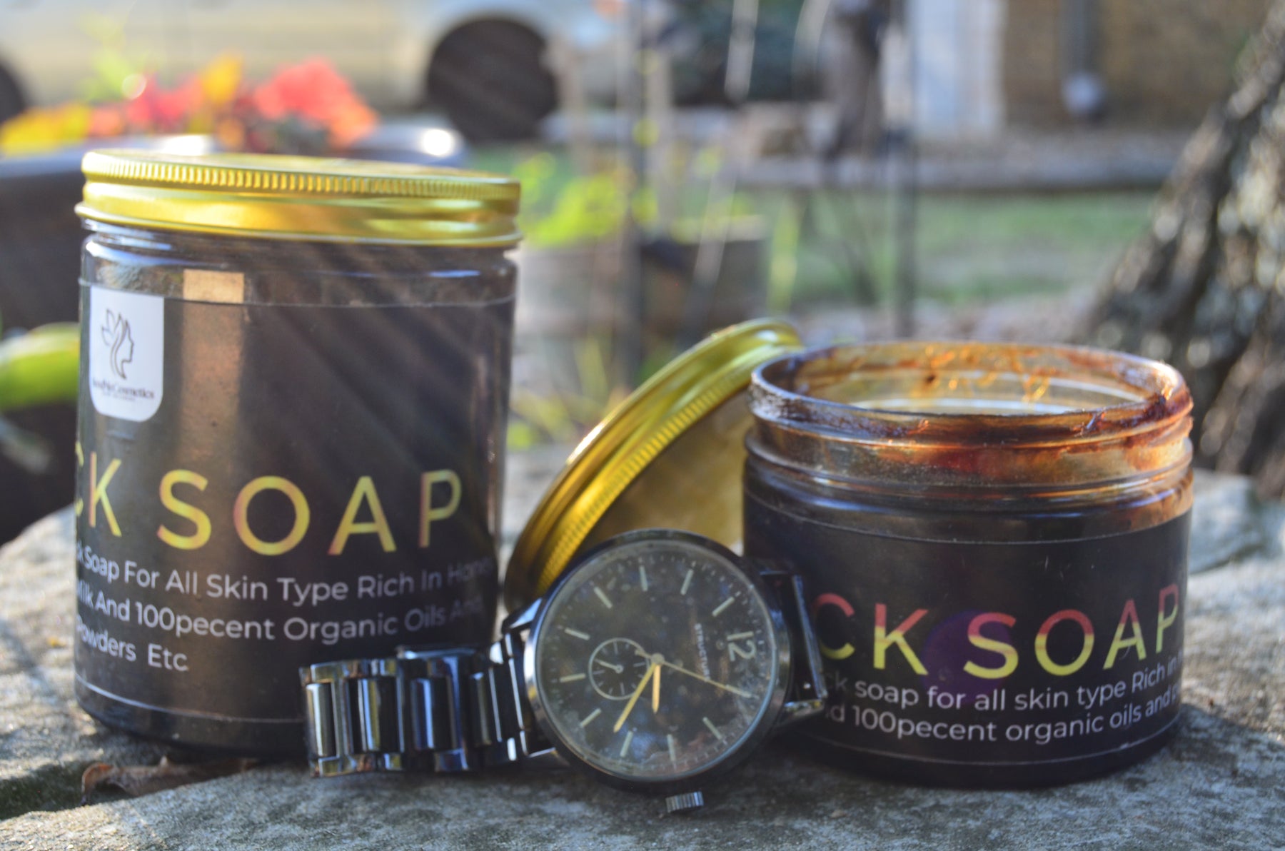 Send Me Cosmetics brand Honey Baked Black Soap (250ml) left, Vanilla Body Butter Center, Honey Baked Black Soap (500ml) right